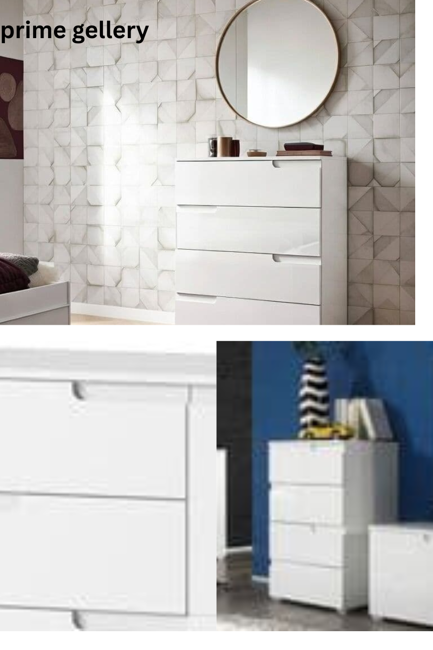 Introducing the Santino White High Gloss Chest of Drawers, a stylish and practical addition to your bedroom or living space. This chest features four spacious drawers, perfect for organizing clothes, accessories, or other essentials. With its sleek high gloss finish, it adds a contemporary touch to any room while providing ample storage. Ideal for enhancing organization and maximizing space efficiency in modern interiors.