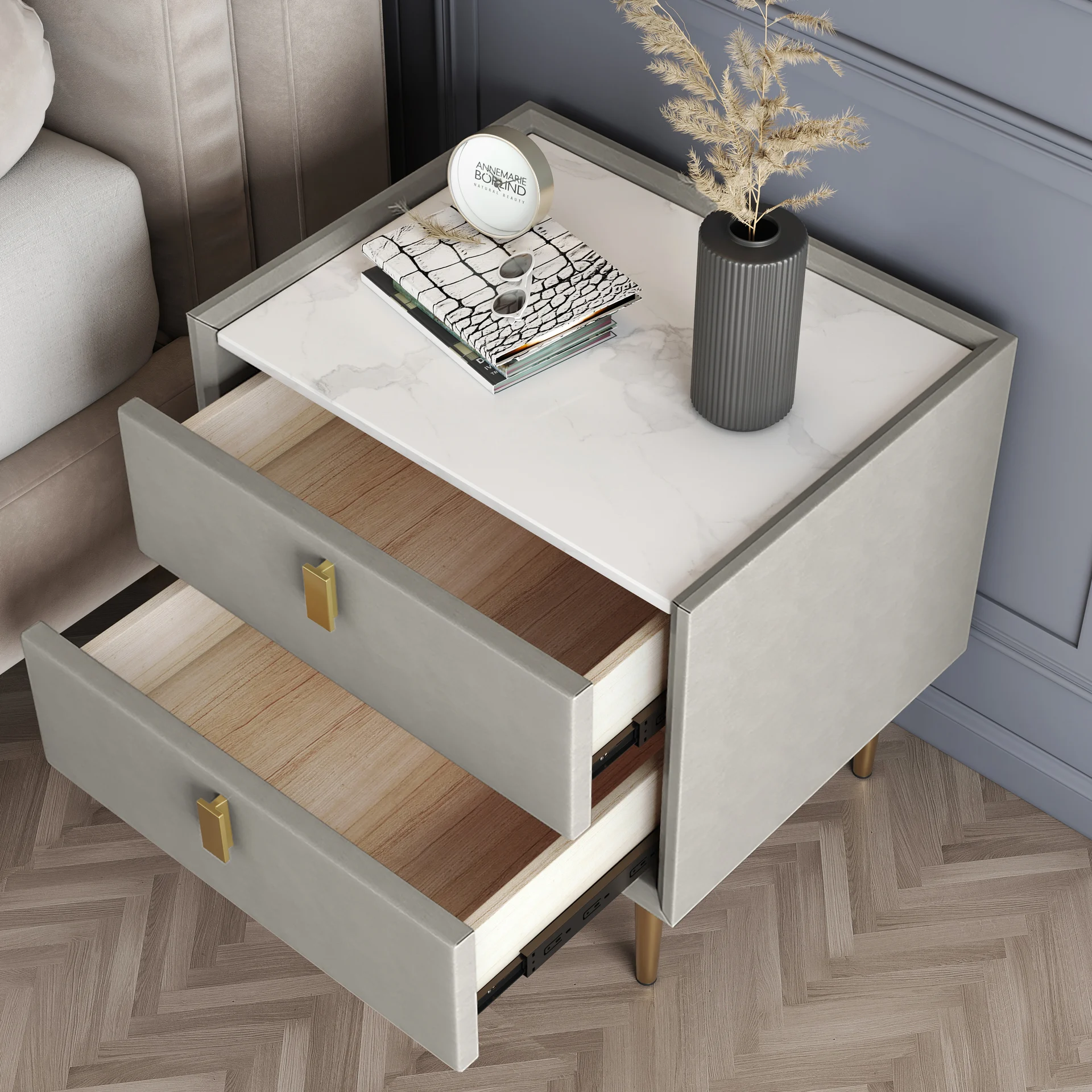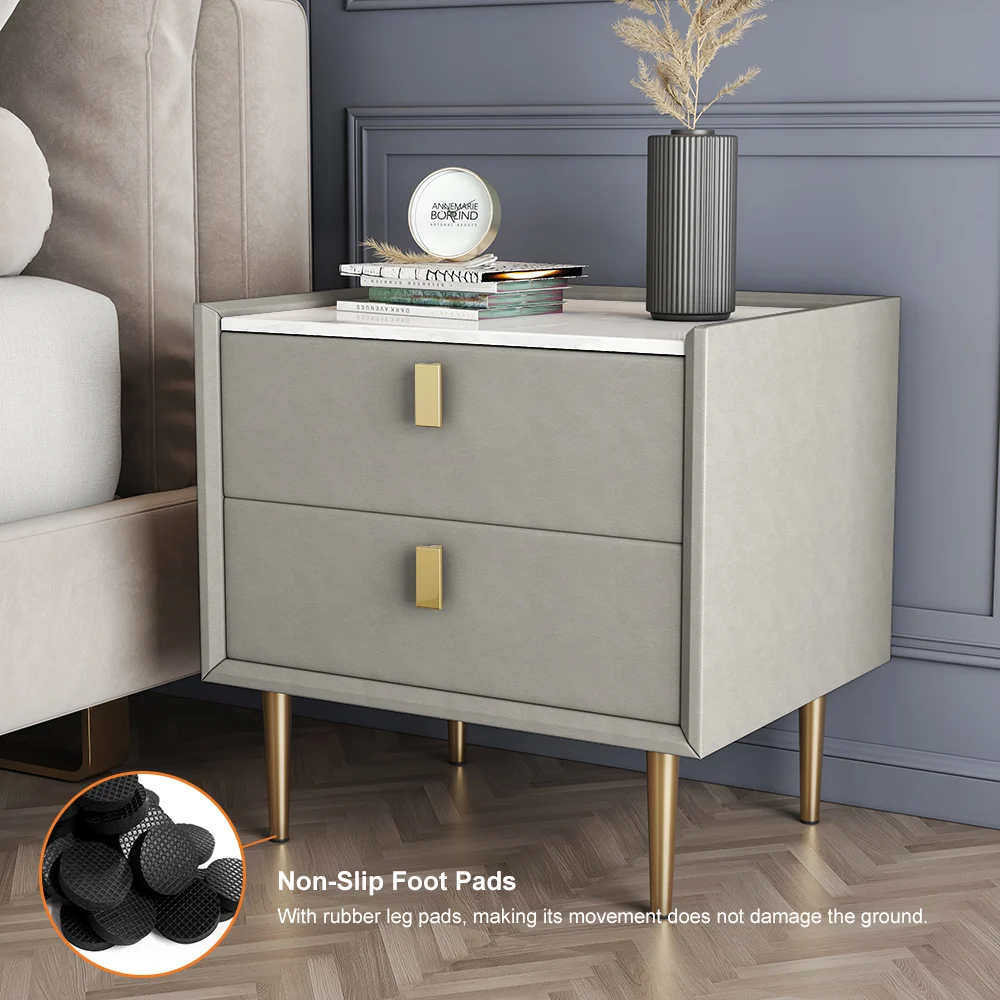 The Sintered Stone Top 2-Drawer Faux Leather Nightstand offers the perfect balance of modern elegance and practical storage. Designed to elevate contemporary bedrooms, this stylish bedside table features a durable sintered stone top, soft faux leather upholstery, and sleek gold metal legs for a luxurious finishing touch.