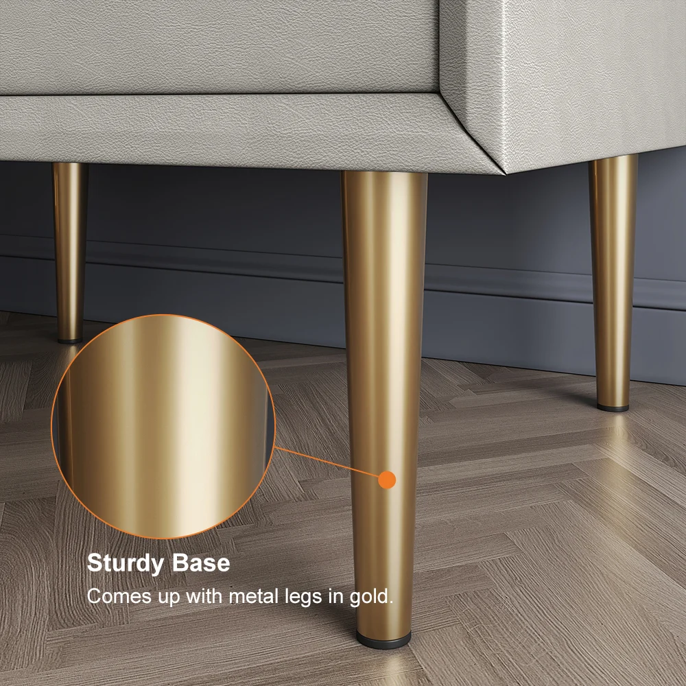 This modern nightstand is crafted with a sophisticated light grey faux leather finish that brings subtle luxury to any bedroom interior. The clean rectangular shape creates a sleek, minimalist silhouette, while the gold metal legs introduce a refined accent that enhances its contemporary appeal.