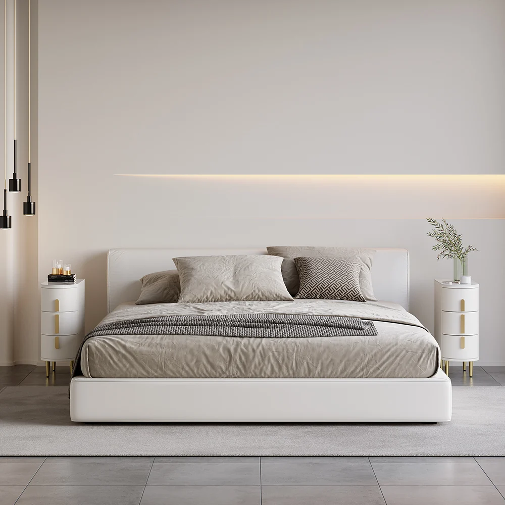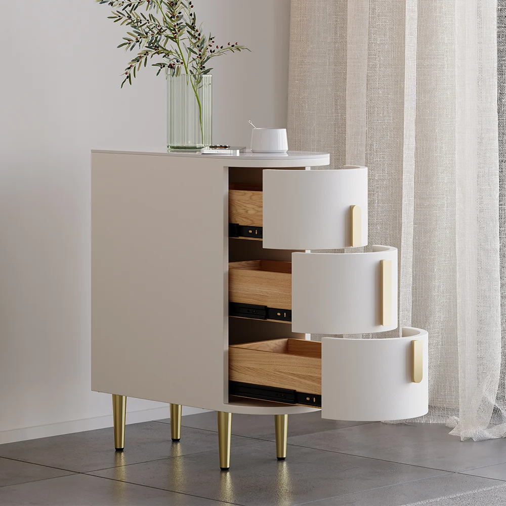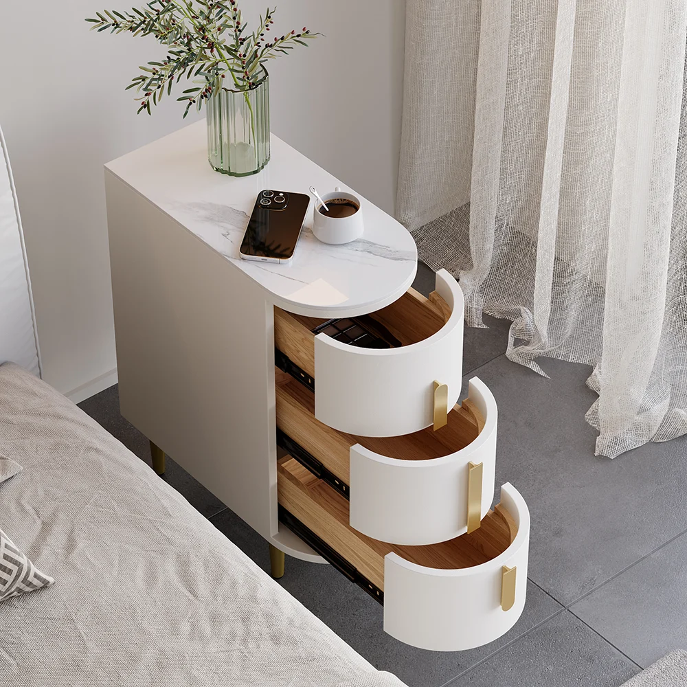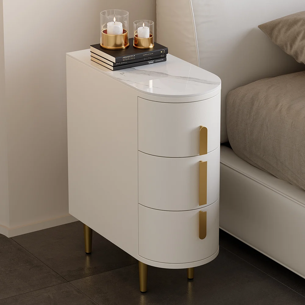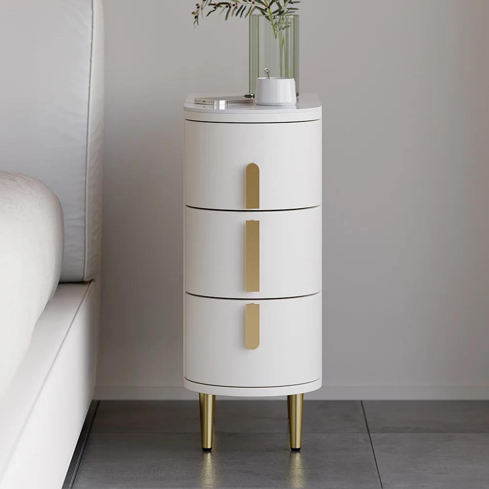Crafted with a contemporary aesthetic, this nightstand features a sophisticated off-white faux leather finish complemented by elegant gold-tone handles. The sleek oval silhouette and clean lines create a refined look that blends effortlessly with modern, minimalist, and luxury bedroom interiors.