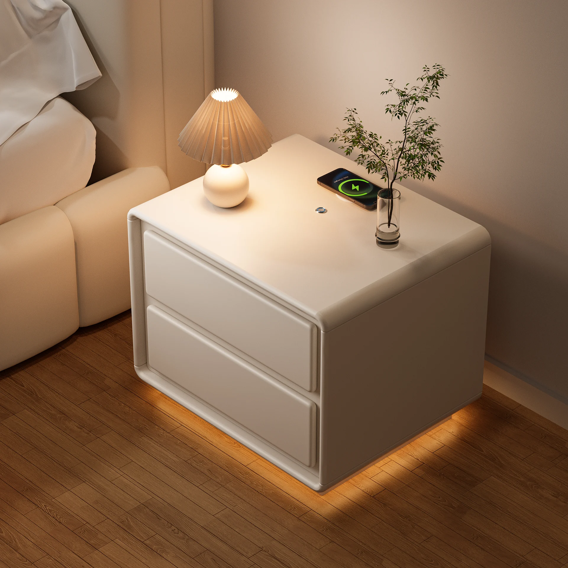 Smart Modern Nightstand – Off-White MDF with Wireless Charging & LED Glow