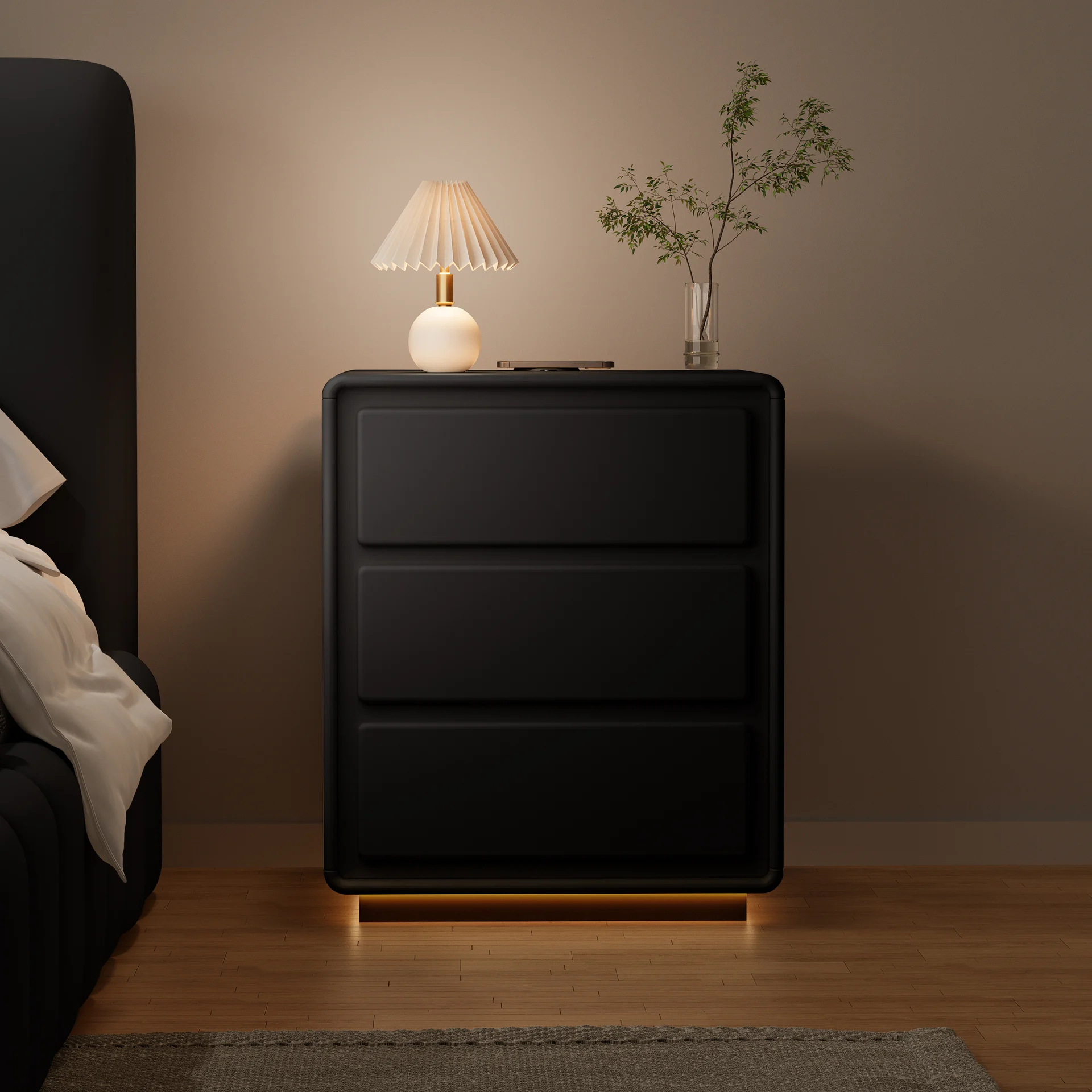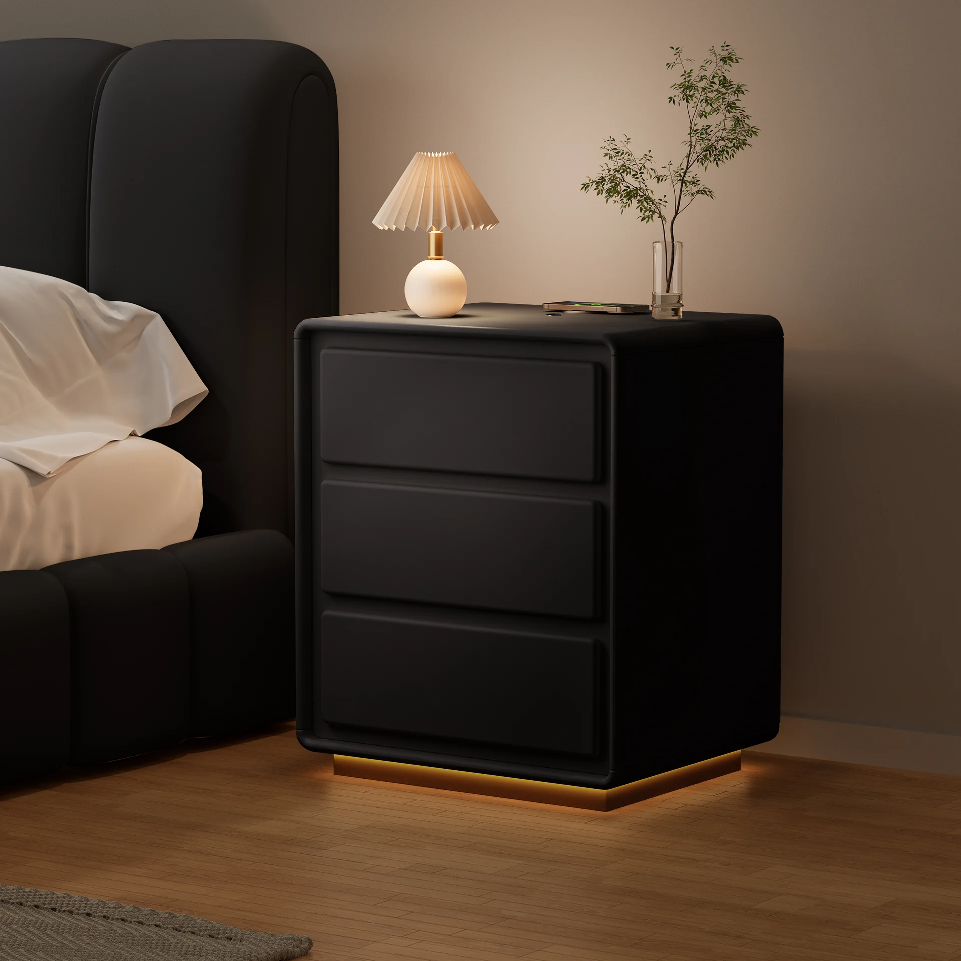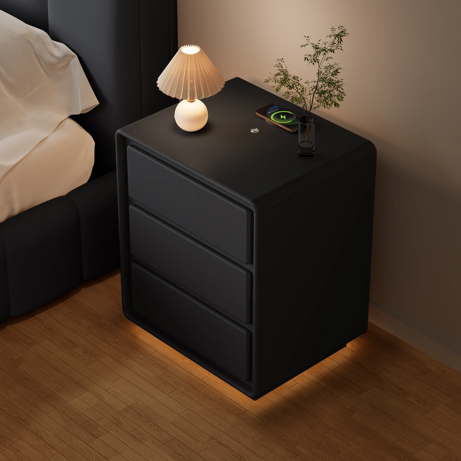 The Future of Bedside Luxury Transform your bedroom into a tech-forward retreat. This nightstand isn’t just a piece of furniture; it’s a dedicated charging hub and a mood-setter. The clean lines and minimalist silhouette are designed to sit perfectly against dark backdrops or alongside gold accents, reflecting a truly premium lifestyle.